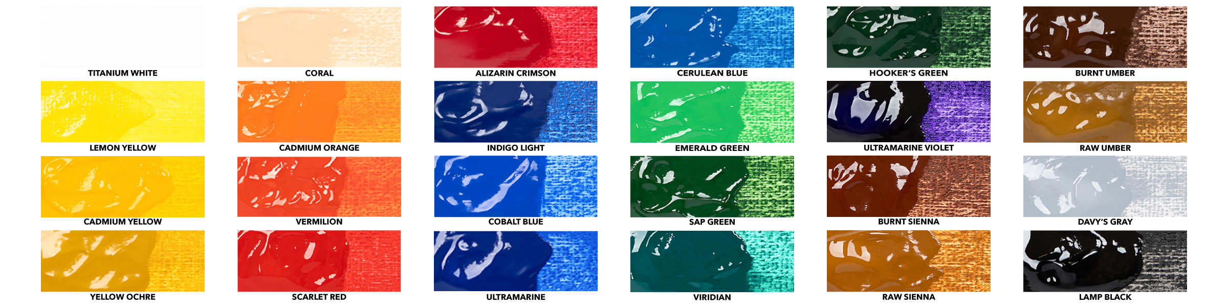 Sada obsahuje 24 12ml zkumavek a barvy, které tato sada obsahuje, jsou titanově bílá, citronově žlutá, okrová žlutá, rumělková, karmínově červená, viridiánová, umbra surová, kobaltová modř, pálená sienna, lampová černá, ultramarínová modrá a hookerova zelená, tělová, středně žlutá, oranžová, šarlatová, smaragdově zelená, mízově zelená, blankytně modrá, ftalo modrá, fialová, surová sienna, pálená umbra a šedá.