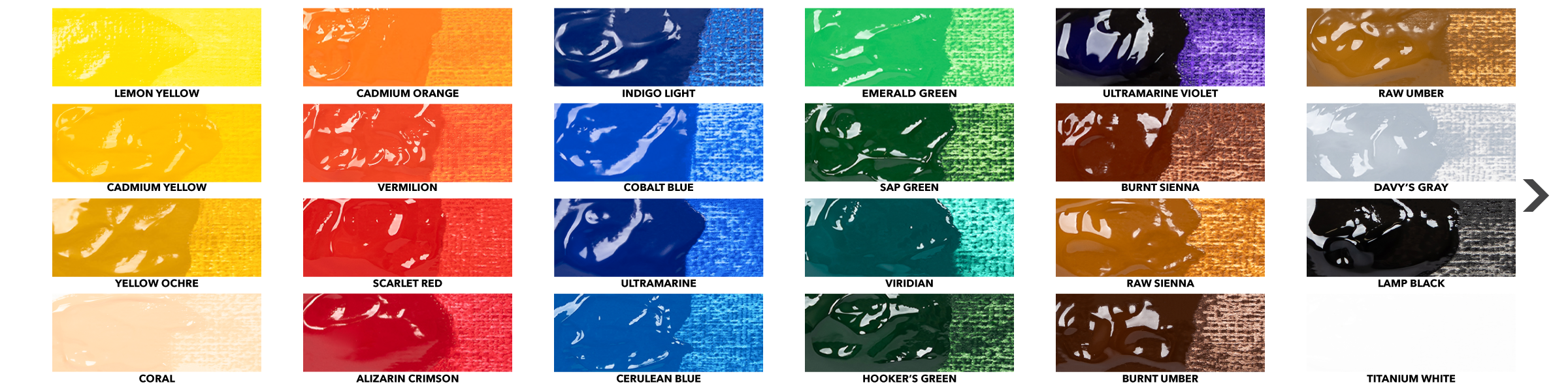 48 x 22 ml Tubes : Jaune citron, Jaune cadmium, Ocre jaune, Corail, Orange cadmium, Vermillon, Rouge écarlate, Alizarine cramoisie, Indigo clair, Bleu cobalt, Outremer, Bleu céruléen, Vert émeraude, Vert sève, Vert viride, Vert Hooker, Violet outremer, Terre de Sienne brûlée, Terre de Sienne naturelle, Terre d'ombre brûlée, Terre d'ombre naturelle, Gris de Davy, Noir de fumée, Blanc de titane, Beige doux, Doré Jaune profond, Profond Jaune, Sépia, Orange Rouge, Ocre jaune Profond, Cadjuvant Vert, Magenta, Jaune Vert, Permanent Vert, Chromoi vert, Gris clair Blue, Sky Blue, Vi françaisolet, Violet Lac, Payne's Gris, Sarcelle Grun, bleu de Prusse, Van Dyck Brown, Rose, Grenadine, Argent, Or et cuivre.