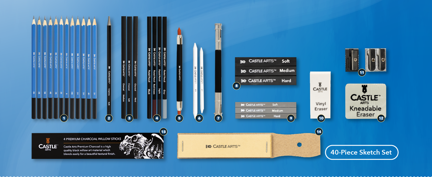 Det här setet är den ultimata kollektionen när det gäller att rita och skissa! Med ett stort utbud av expertverktyg, kommer detta kit att låta dig skapa tunna, skarpa linjer, skugga och blanda vackert, och med glädje skapa fantastiska konstverk som du kommer att vara stolt över att visa upp och dela.