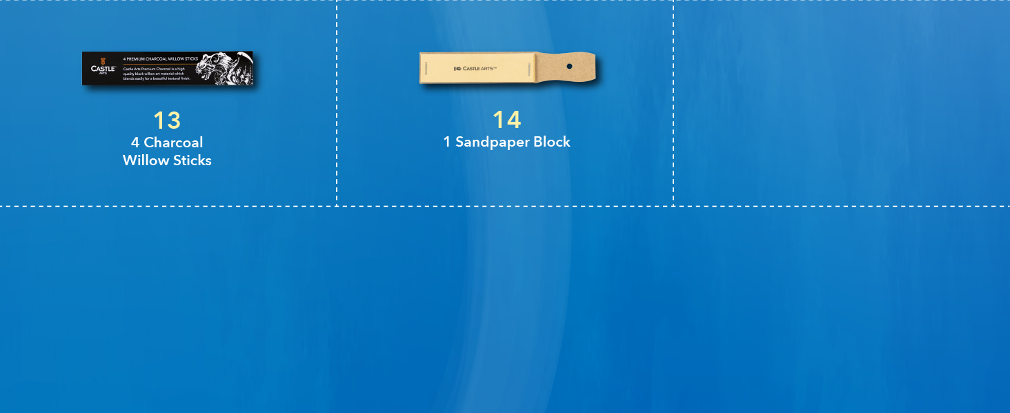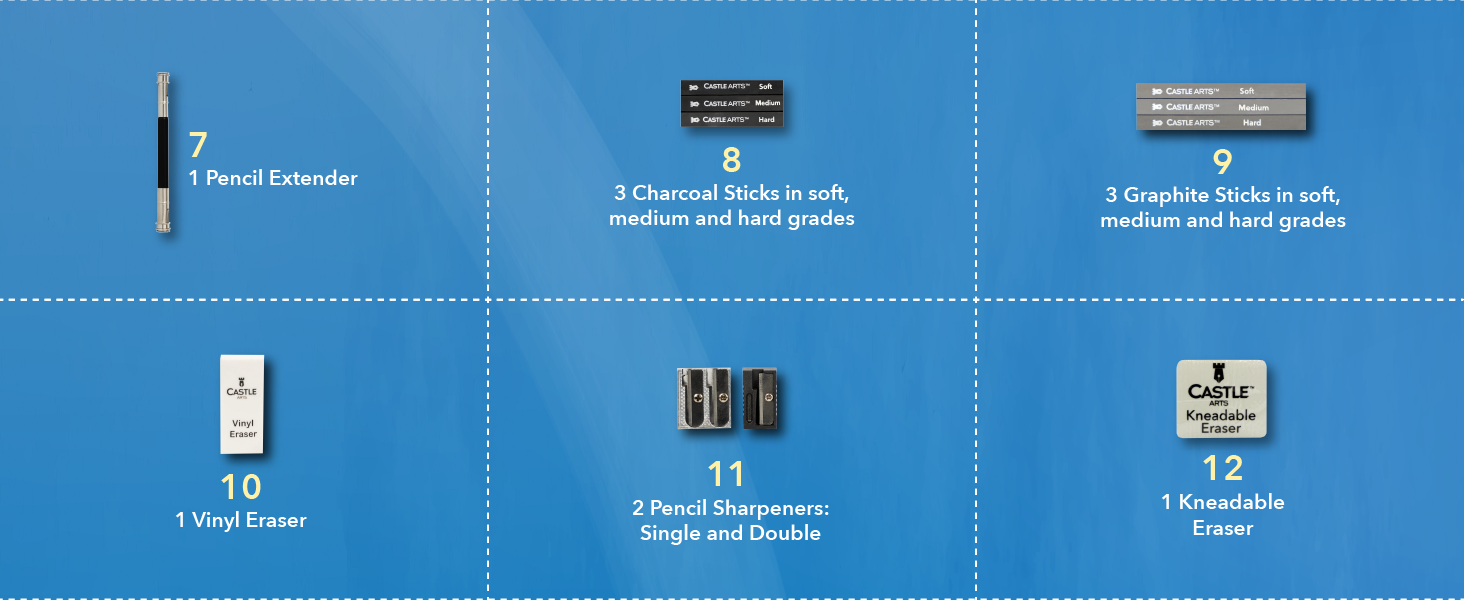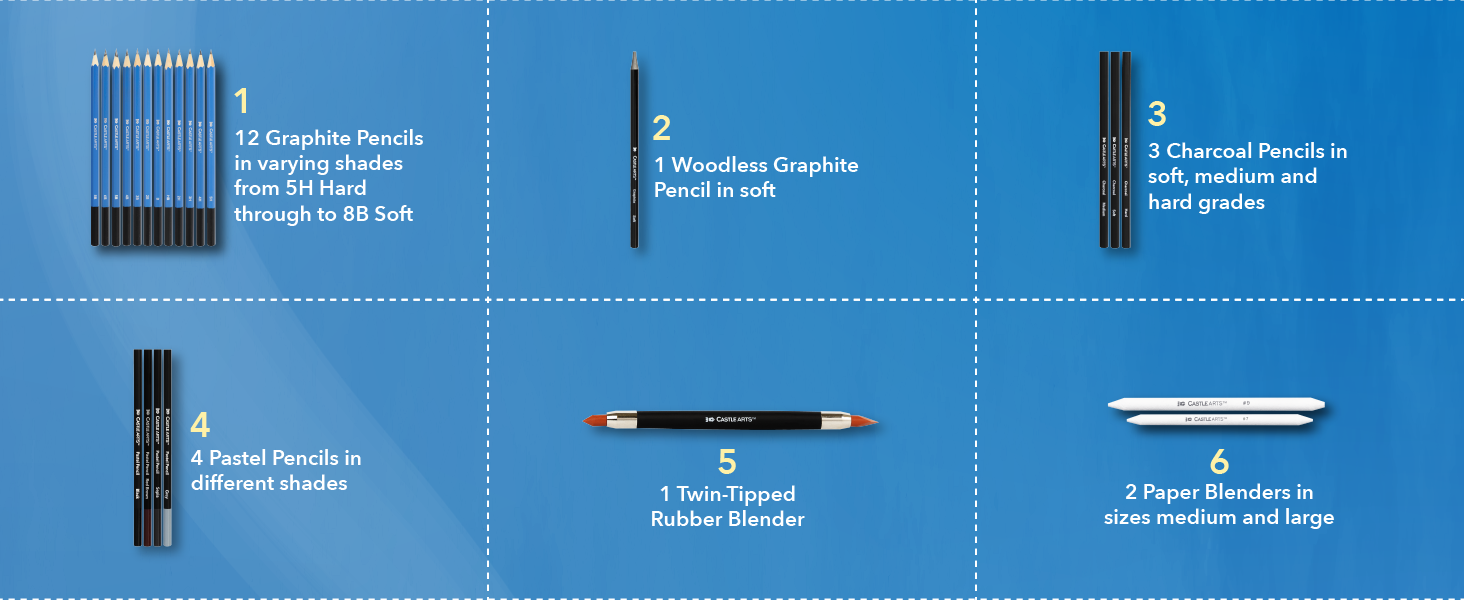 Detta professionella pennset innehåller 12 grafitpennor, 4 pastellpennor i olika nyanser, 3 kolpennor i olika kvaliteter, en mjuk grafitskisspenna, 2 pappersstubbar, en pennförlängare, en gummimixer, 4 kol. pilstavar, 3 kolstavar, 3 grafitstavar, en plastvässare, en tvåhålsvässare, ett pennsudd i plast, ett knådat kolsudd och ett sandpappersblock.